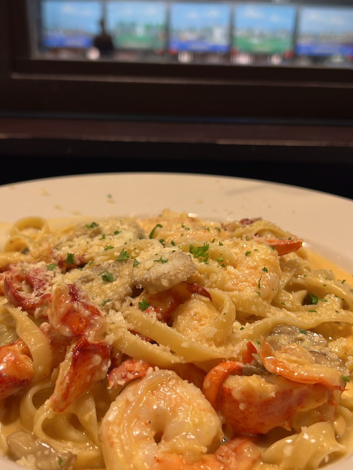The menu is loaded with options, and we decided on the Shrimp and Lobster Pasta and the New England Fish and Chips. The pasta did not disappoint. It was stacked with a hearty amount of shrimp and lobster in a creamy mushroom sauce topped with Parmesan cheese and truffle oil. The fish was battered to a crispy perfection.